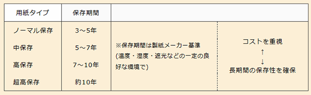 ビジコムでは、一般的なノーマル保存タイプに加え、より保存性を高めた中保存紙、高保存紙、超高保存紙をご用意しています。